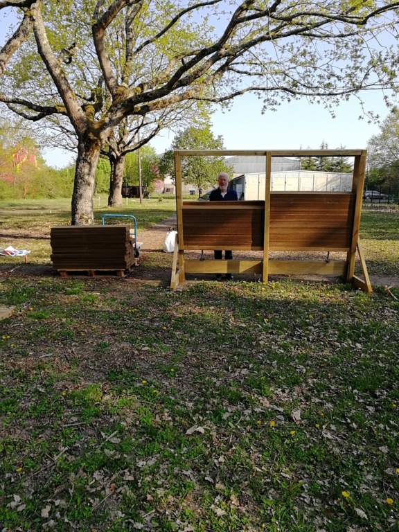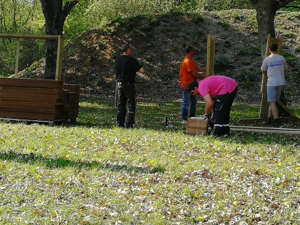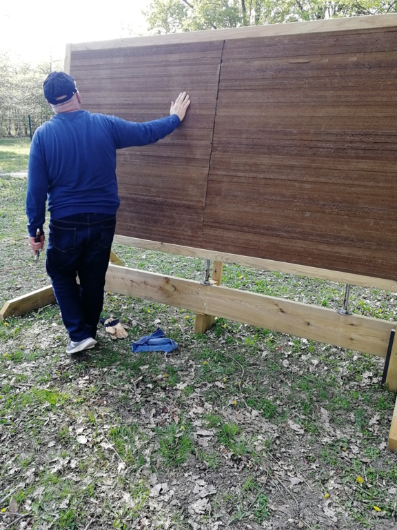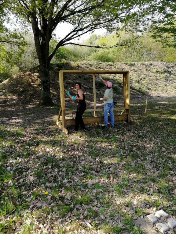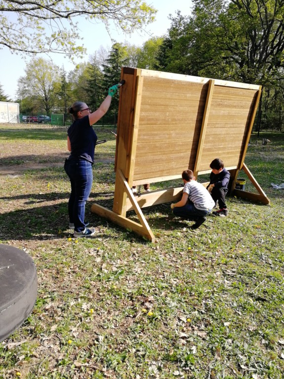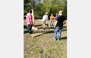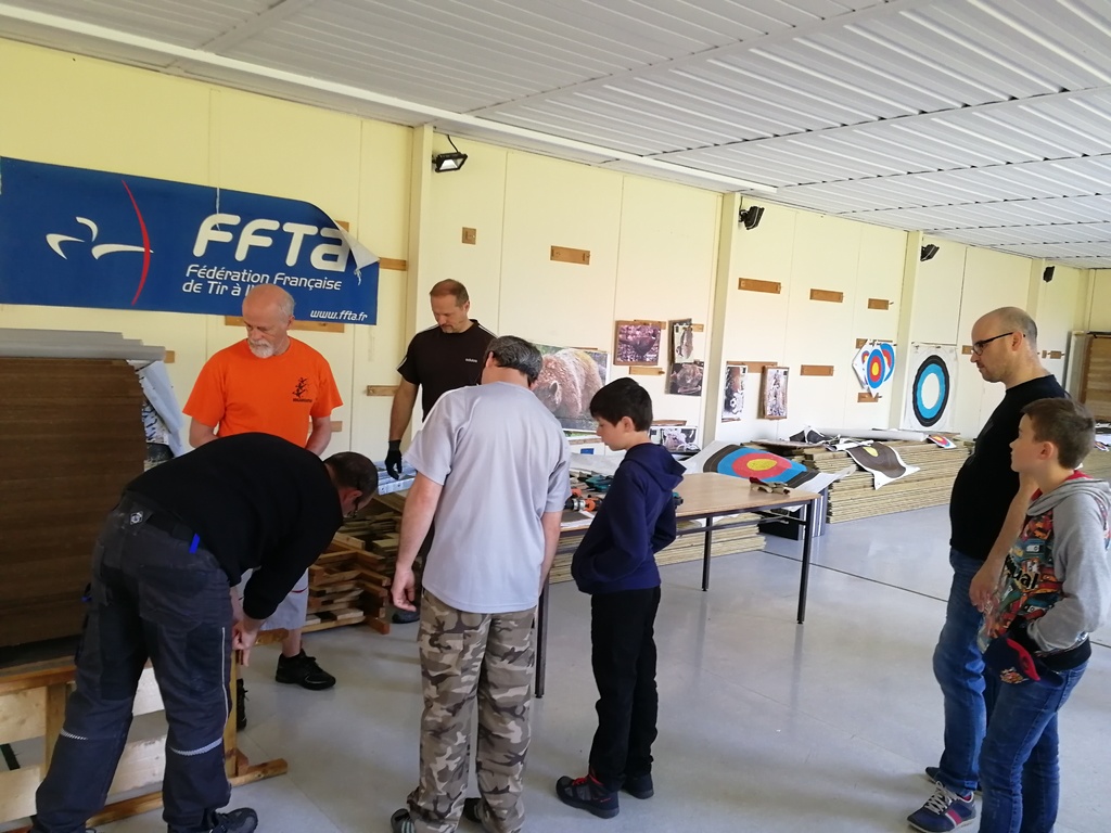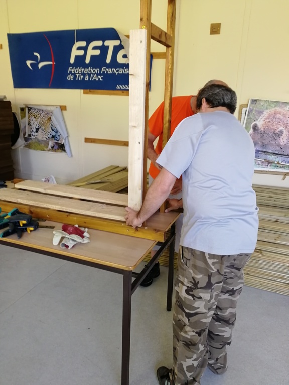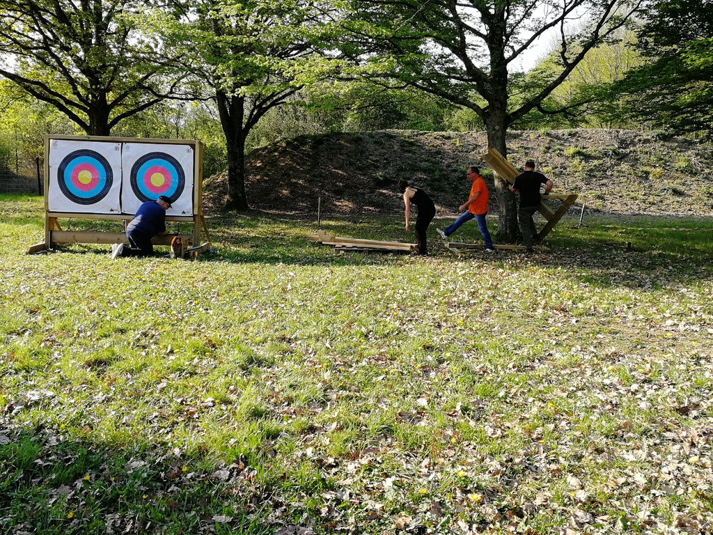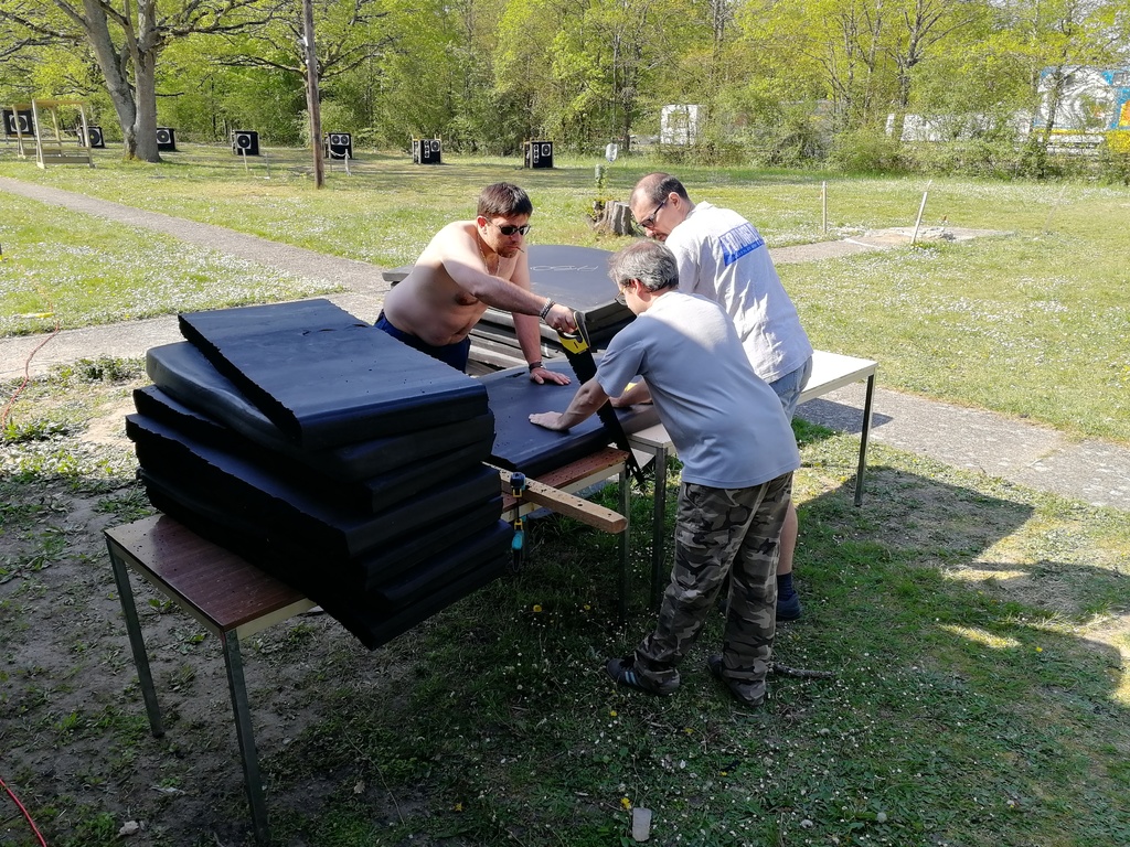 Ce samedi, une partie des archers du Club s'est portée volontaire pour porter du bois, découper du caoutchouc, visser, dévisser, déplacer, lasurer, etc.....bref, monter des cibles sur le pas de tir extérieur.